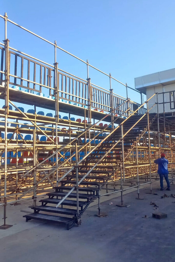 A Tube World fabrica e instala escada montada com estrutura metálica reforçada, ideal para circulação de público em eventos, obras e estruturas temporárias ou permanentes.